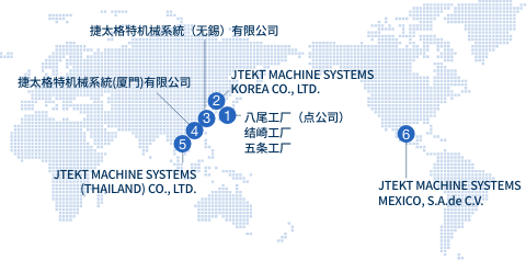 生产基地/关联公司 网站首页>公司信息>生产基地/关联公司 生产基地/关联公司 事业单位 营业所 关联子公司 JTEKT集团 ❶ Japan 八尾工厂(总公司) 结崎工厂 五条工厂 株式会社捷太格特机械技术 ❷ Korea JTEKT MACHINE SYSTEMS KOREA CO., LTD.(JMSKR) ❸ China 捷太格特机械系统(无锡)有限公司(JMSWX) ❹ China 捷太格特机械系統(厦門)有限公司(JMSXM) ❺ Thailand JTEKT MACHINE SYSTEMS (THAILAND) CO., LTD.(JMSTH) ❻ Mexico JTEKT MACHINE SYSTEMS MEXICO, S.A.de C.V.(JMSMX)